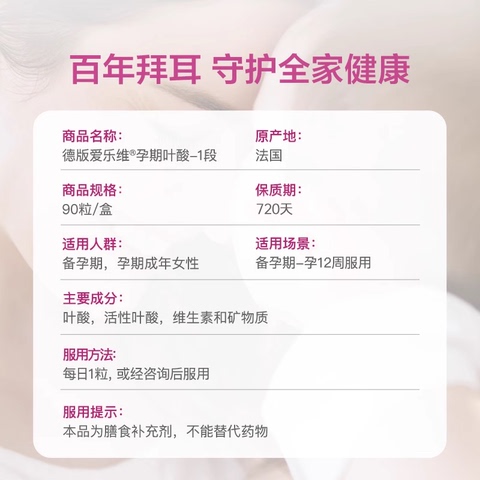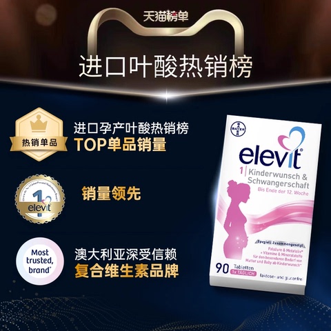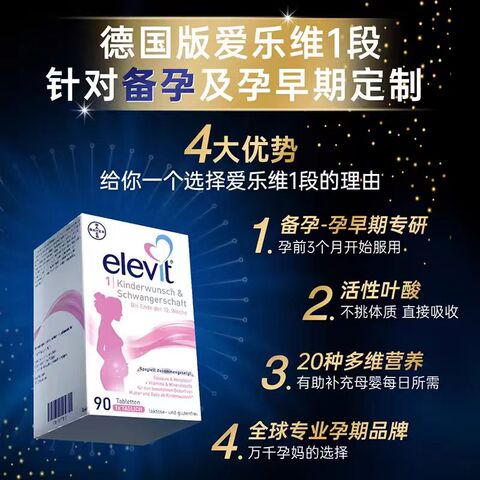 德国爱乐维Elevit孕妇孕早期活性叶酸维生素1段90粒/盒。德国版爱乐维1段,针对备孕及孕早期定制,20种维生素+矿物质补充不止叶酸,进一步细分“备孕一孕12周阶段所需营养,针对补充满足母婴每日所需,营养不滥用!