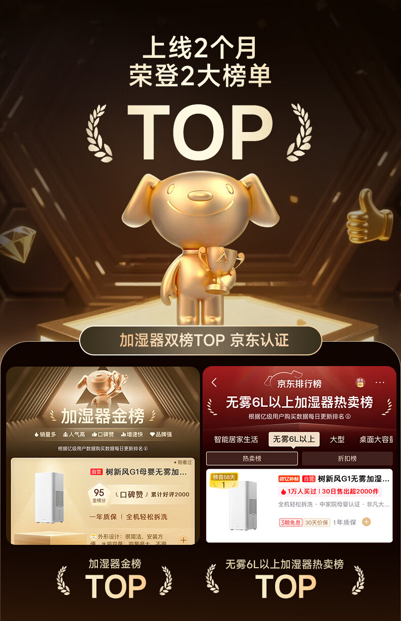 树新风G1无雾加湿器【维嘉同款】空气加湿器静音除菌全拆洗母婴级认证客厅卧室大容量家用婴儿孕妇