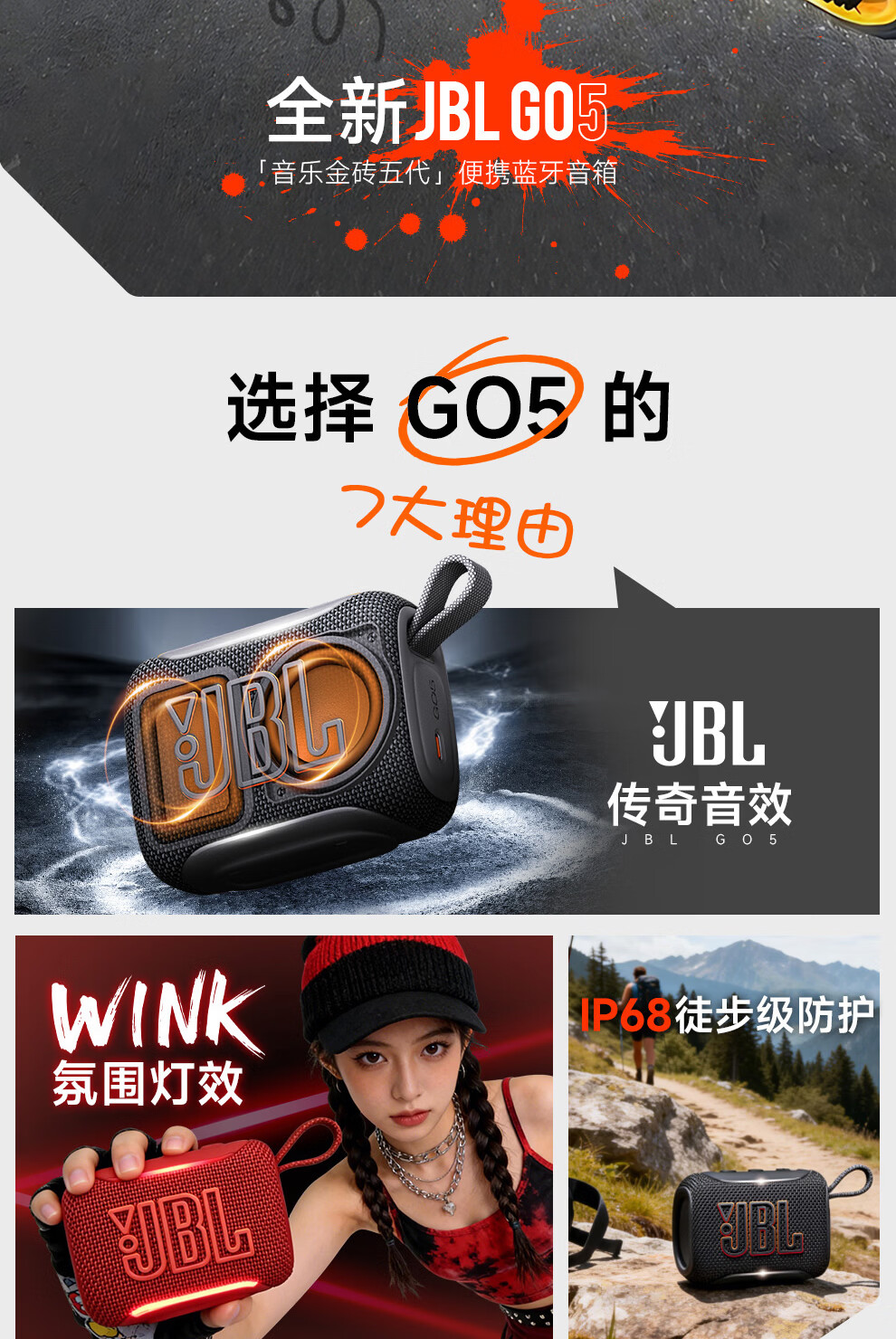 JBL GO5 音乐金砖五代 蓝牙音箱 便携迷你音箱 户外徒步骑行 防水音箱 低音炮音响 女神礼物 西柚橘