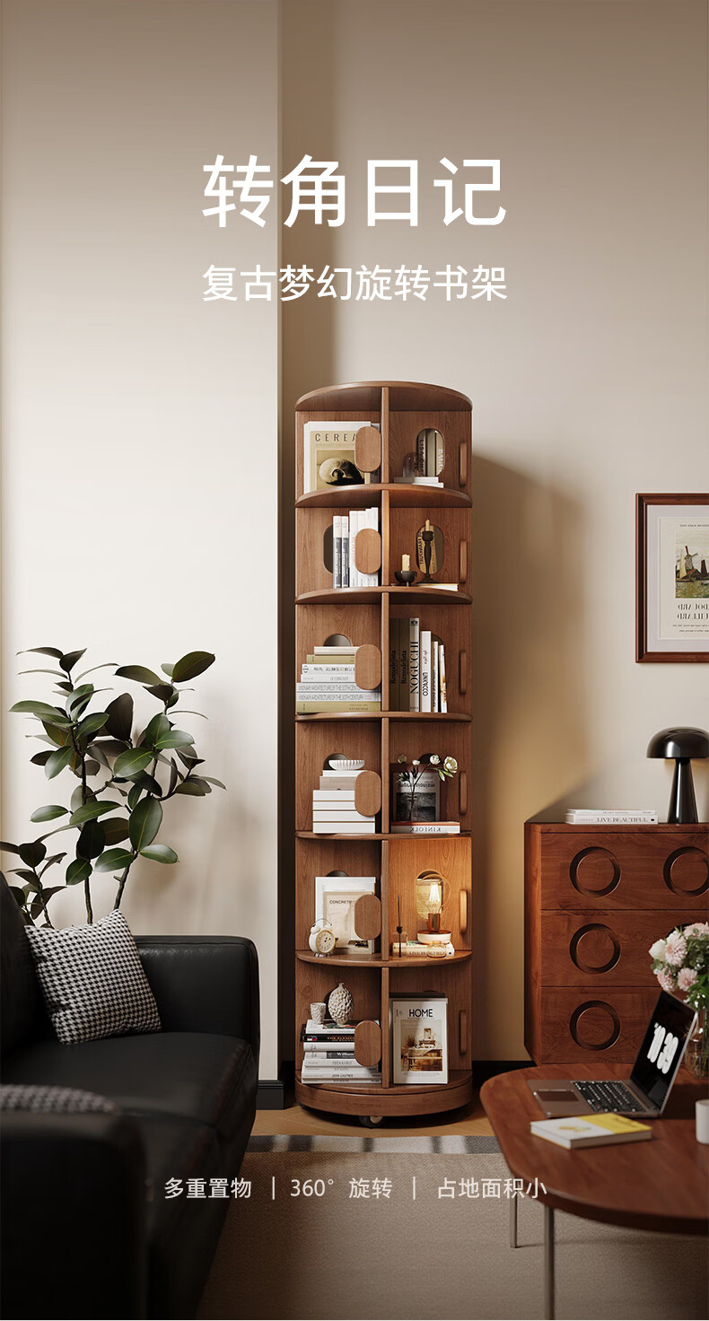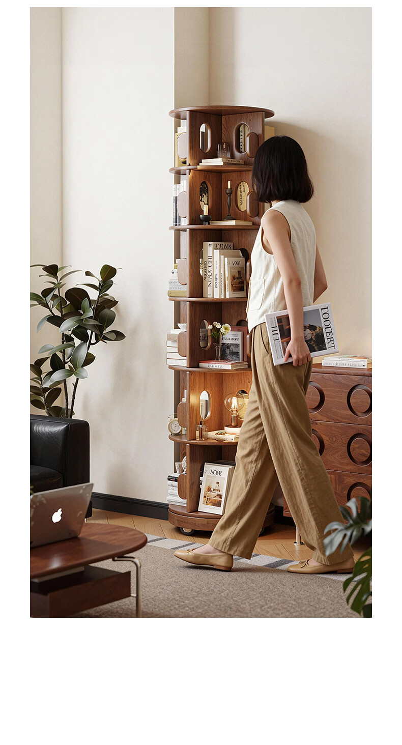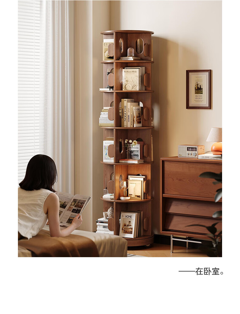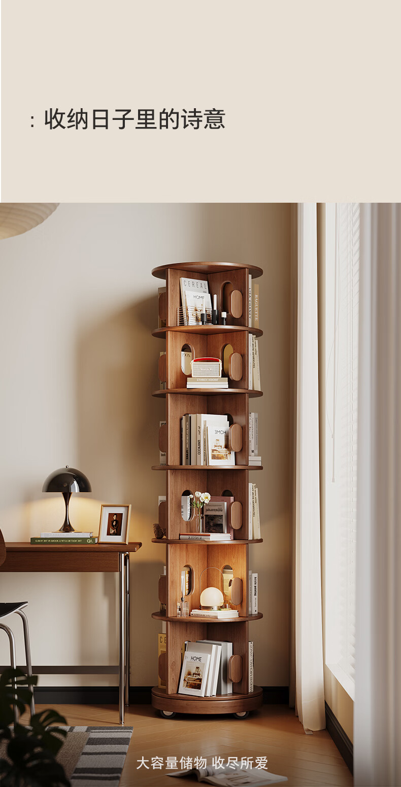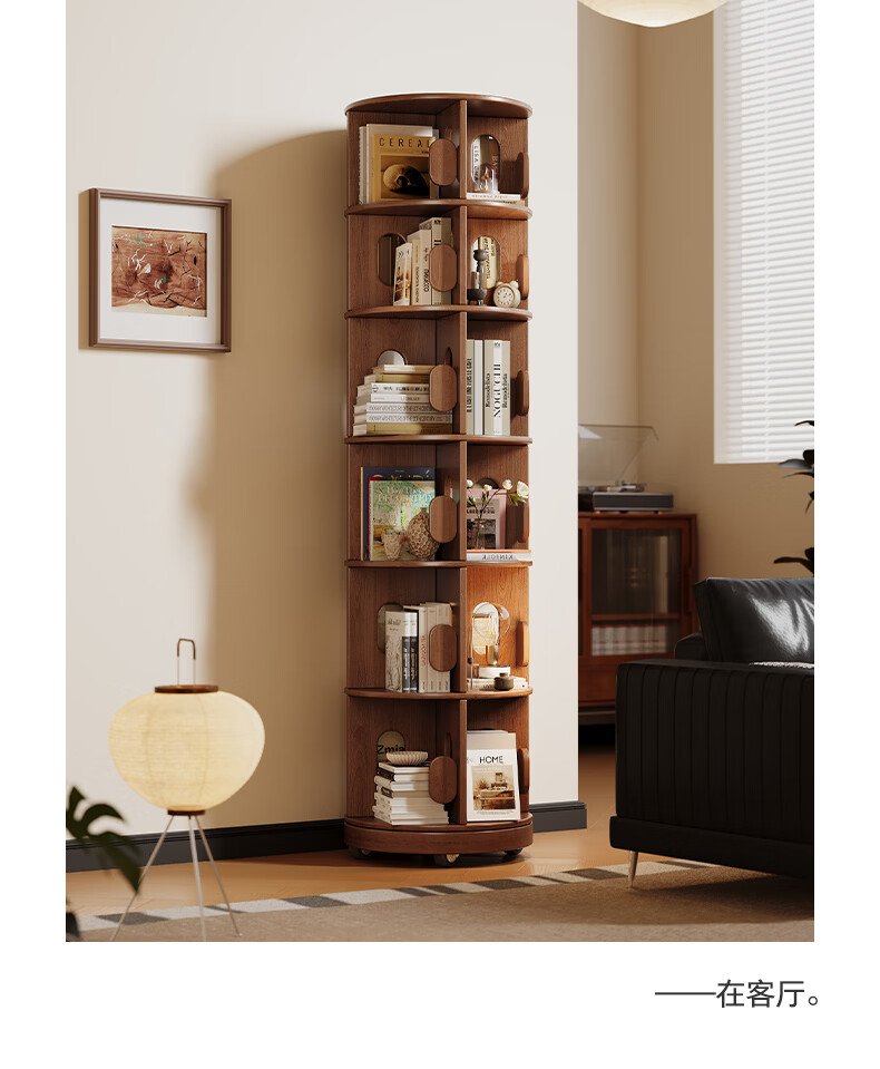 顾家家居实木旋转书架360度书柜置物架落地一体靠墙窄柜子可移动储物柜 【泰国进口FAS级橡胶木】六层胡桃色45*186C 【顾家全托管安心服务-免费送装】
