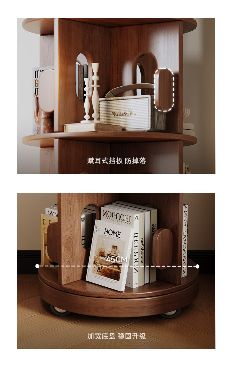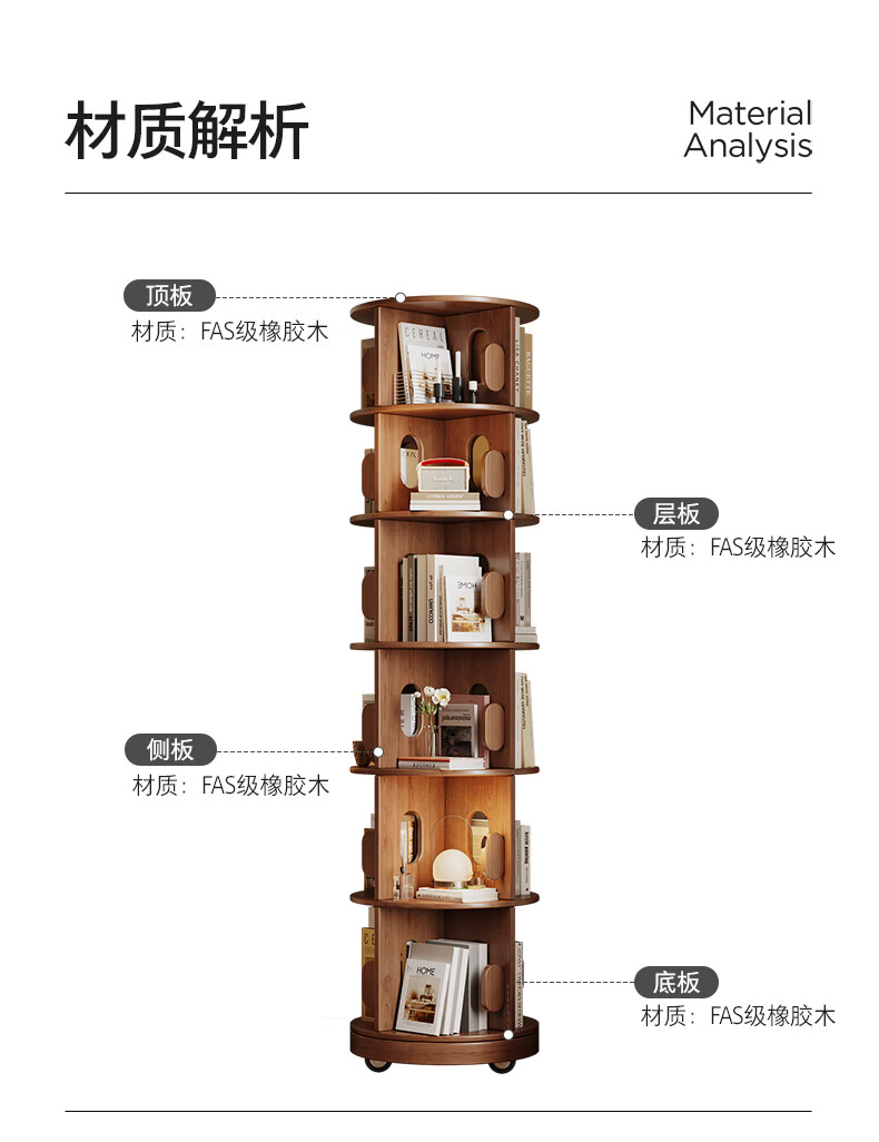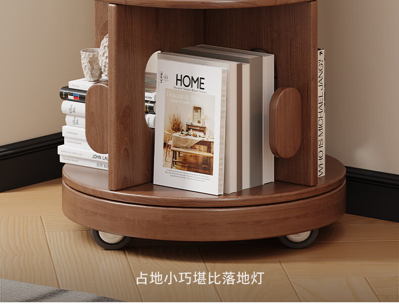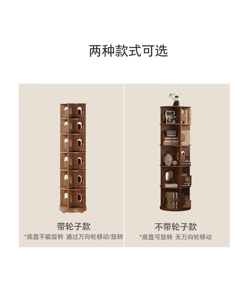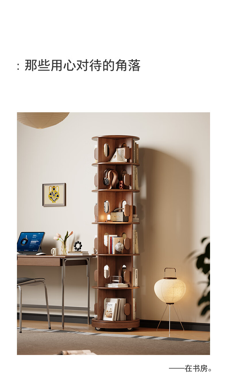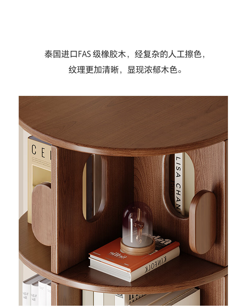 顾家家居实木旋转书架360度书柜置物架落地一体靠墙窄柜子可移动储物柜 【泰国进口FAS级橡胶木】六层胡桃色45*186C 【顾家全托管安心服务-免费送装】