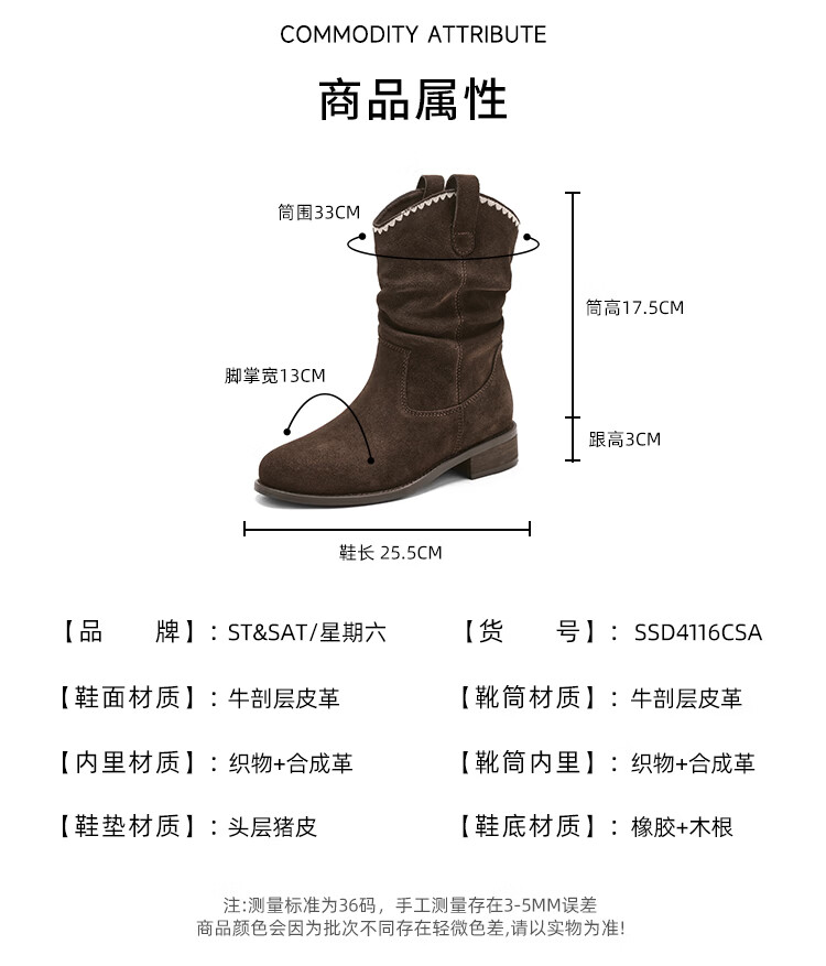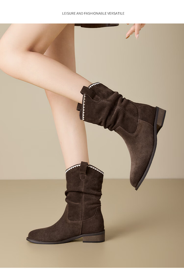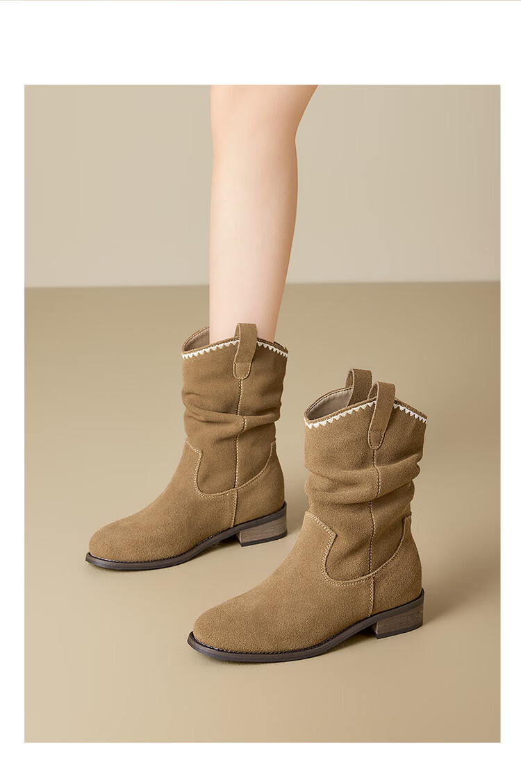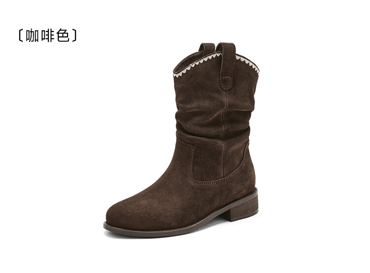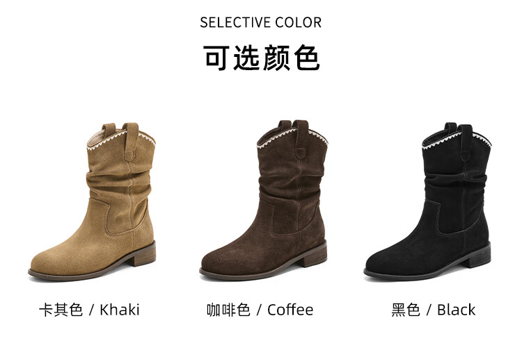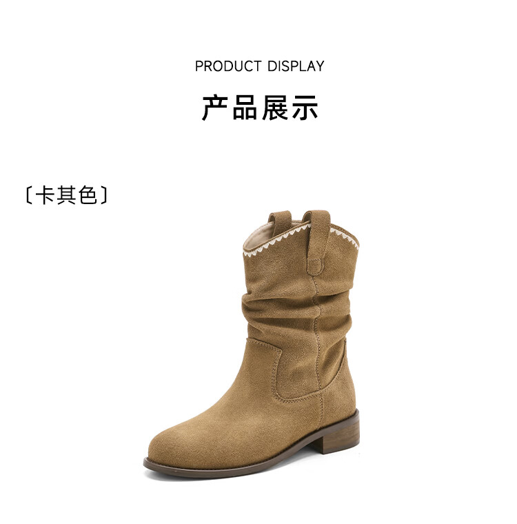 星期六西部牛仔靴女款2025新款秋季美拉德堆堆靴中筒粗跟短靴女靴 卡其色 【牛剖层皮革】跟高3cm 35