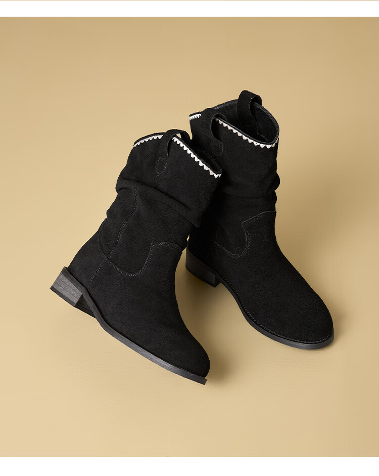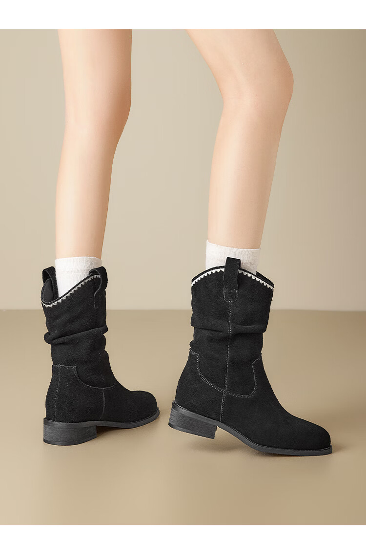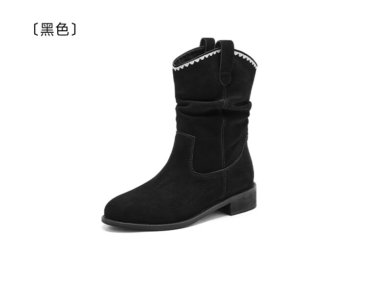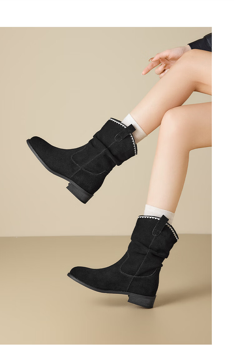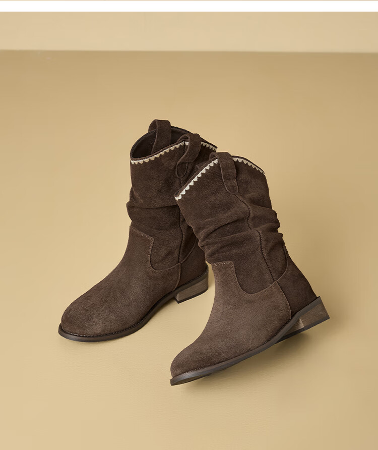 星期六西部牛仔靴女款2025新款秋季美拉德堆堆靴中筒粗跟短靴女靴 卡其色 【牛剖层皮革】跟高3cm 35