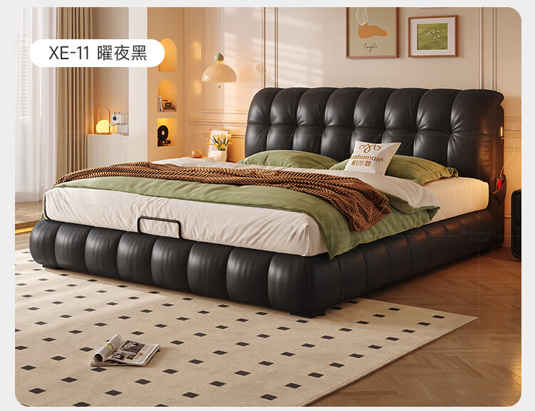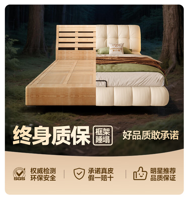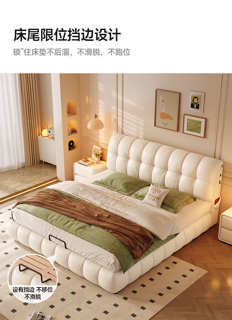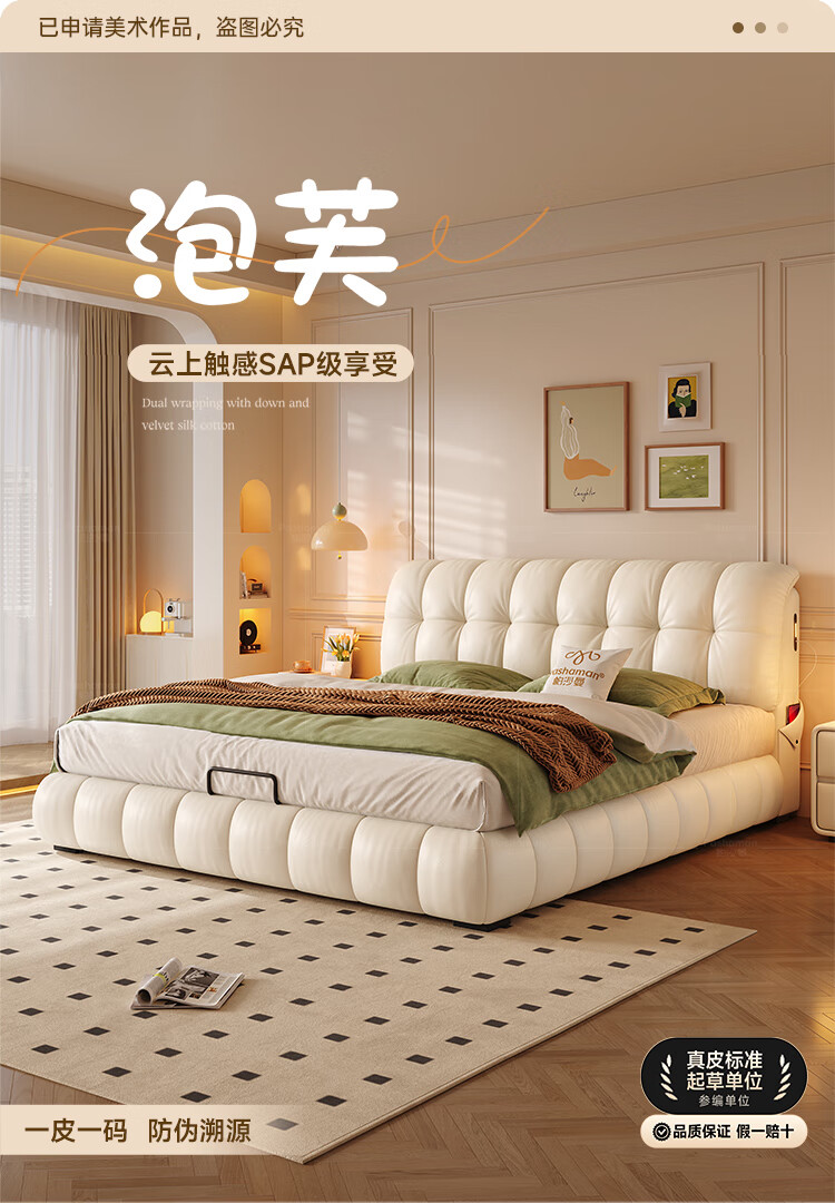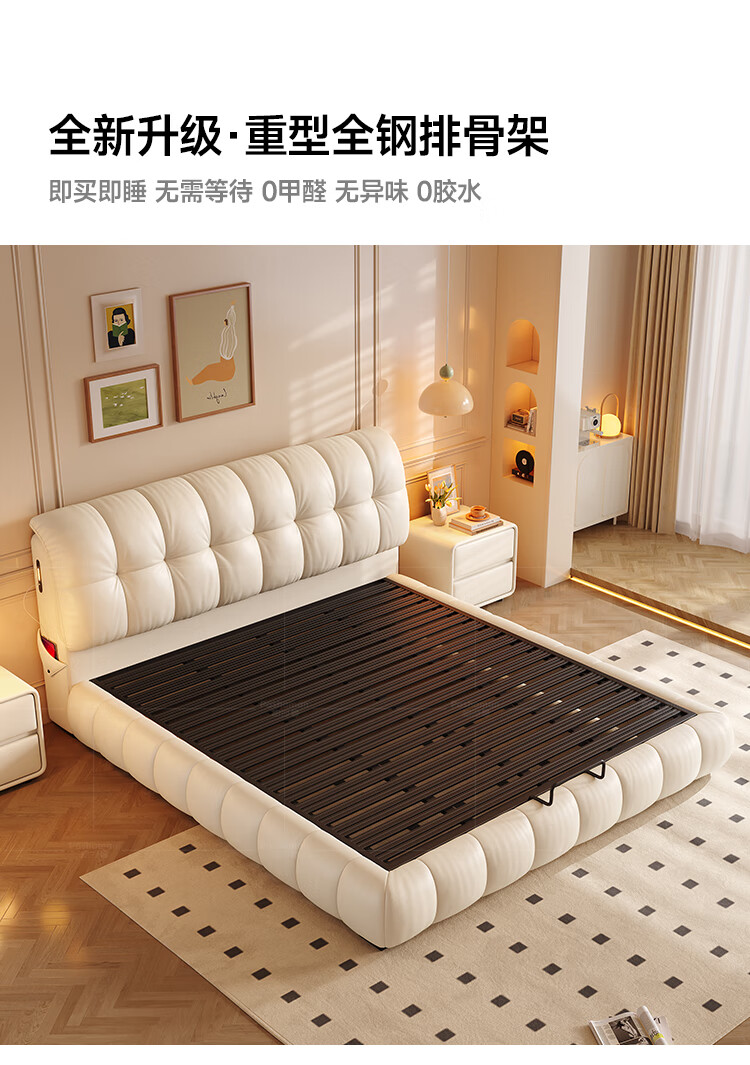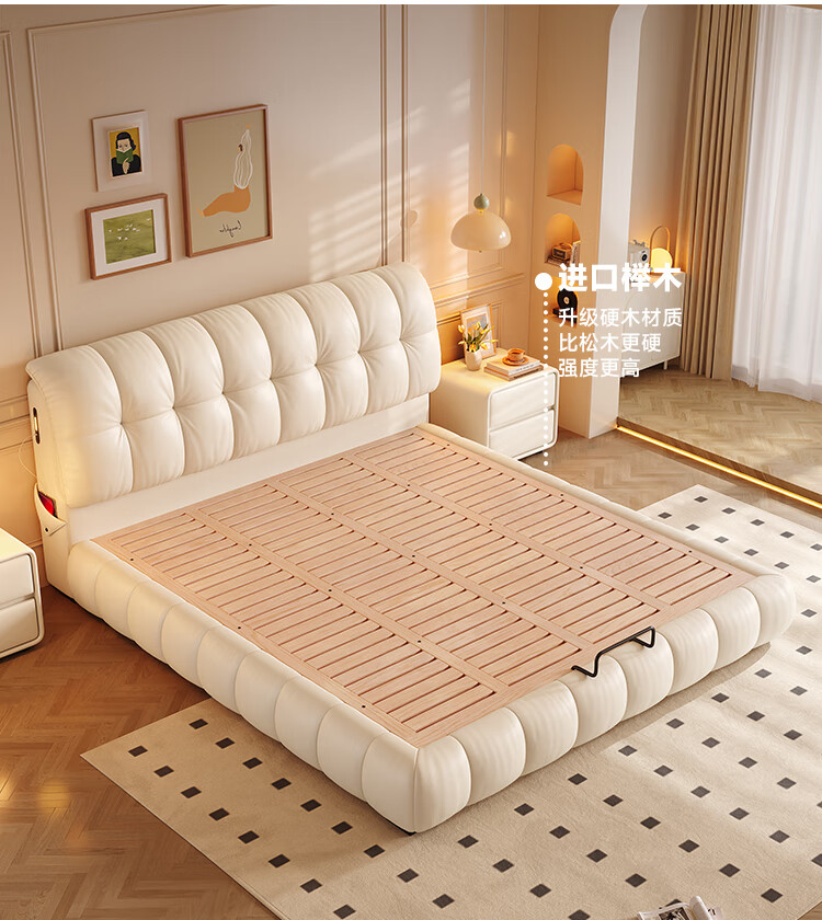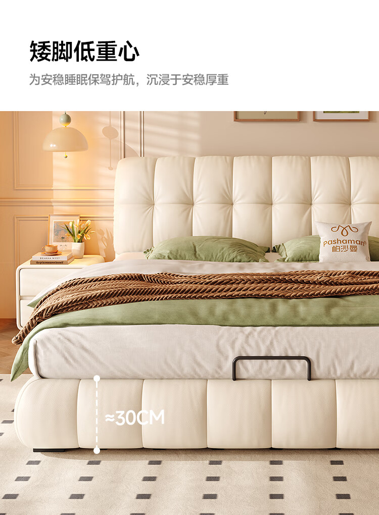 帕沙曼国货补贴真皮床奶油风泡芙主卧双人床现代简约床2025年新款7023CP 【榉木】单床+TR1801#床头柜*2 框架结构1800mm*2000mm