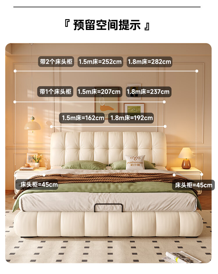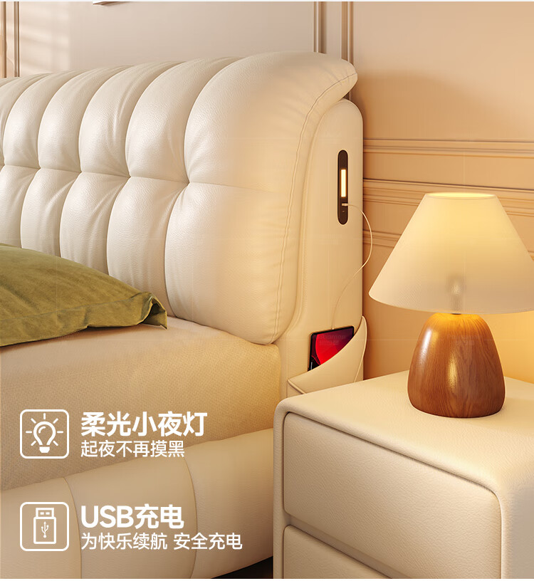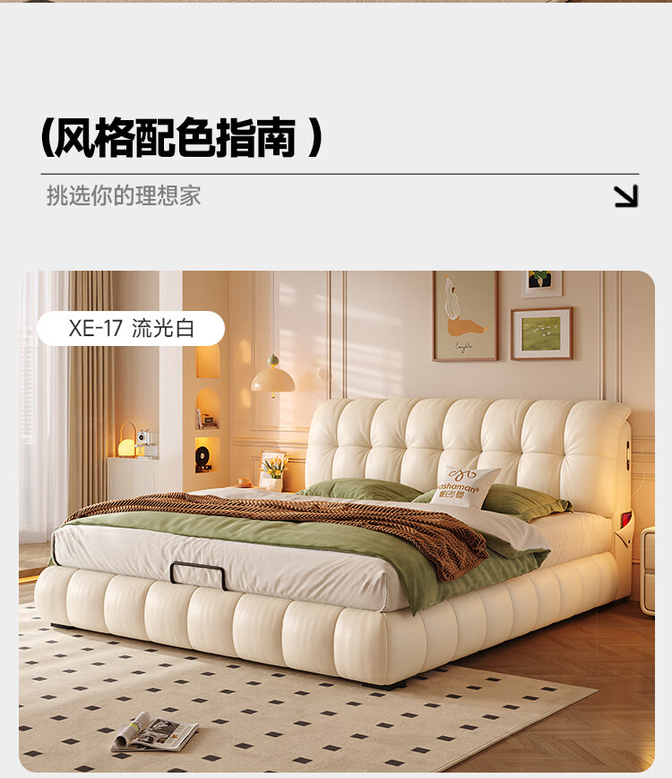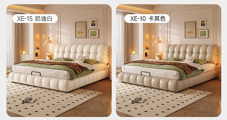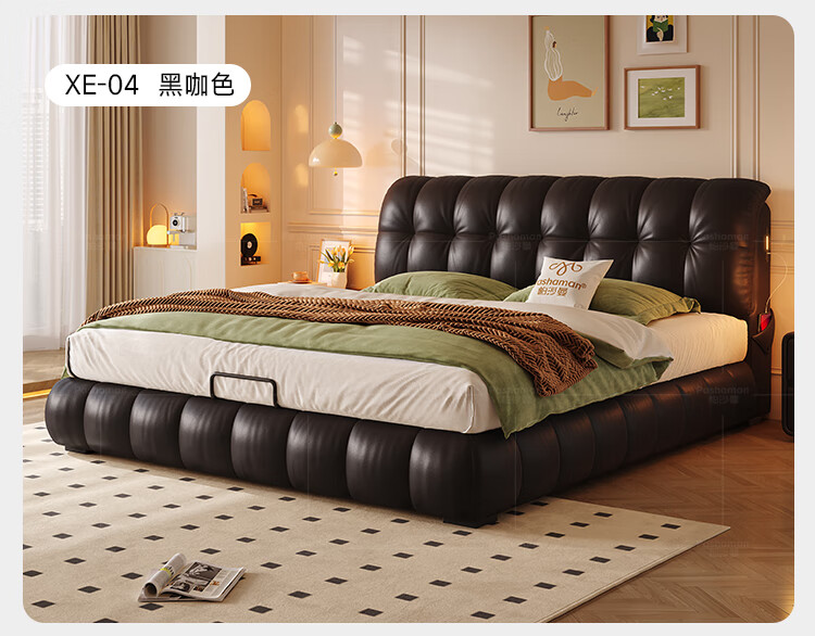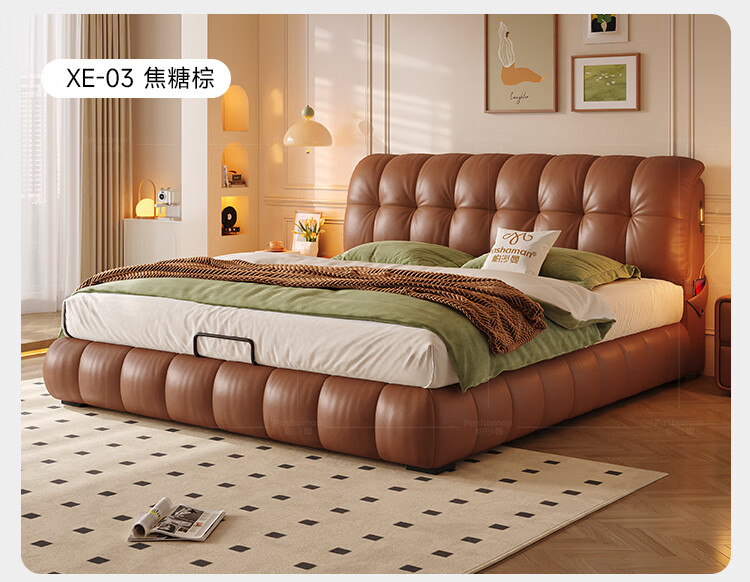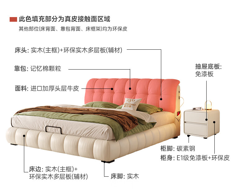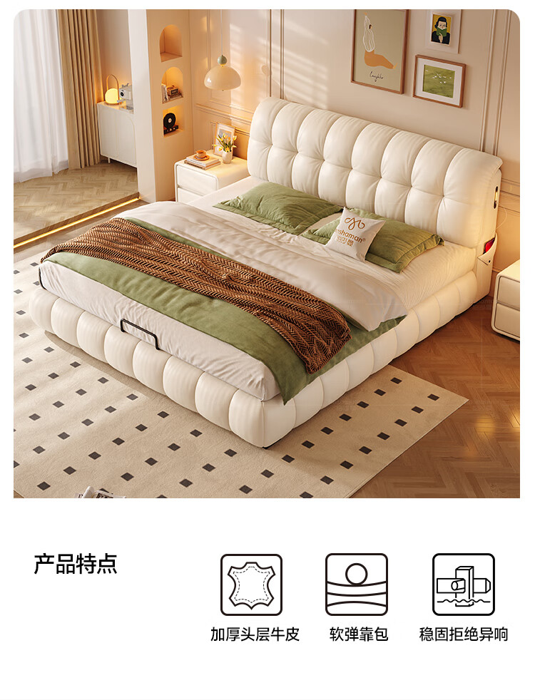 帕沙曼国货补贴真皮床奶油风泡芙主卧双人床现代简约床2025年新款7023CP 【榉木】单床+TR1801#床头柜*2 框架结构1800mm*2000mm