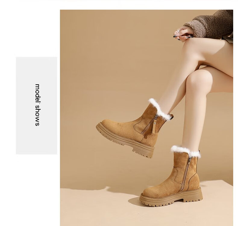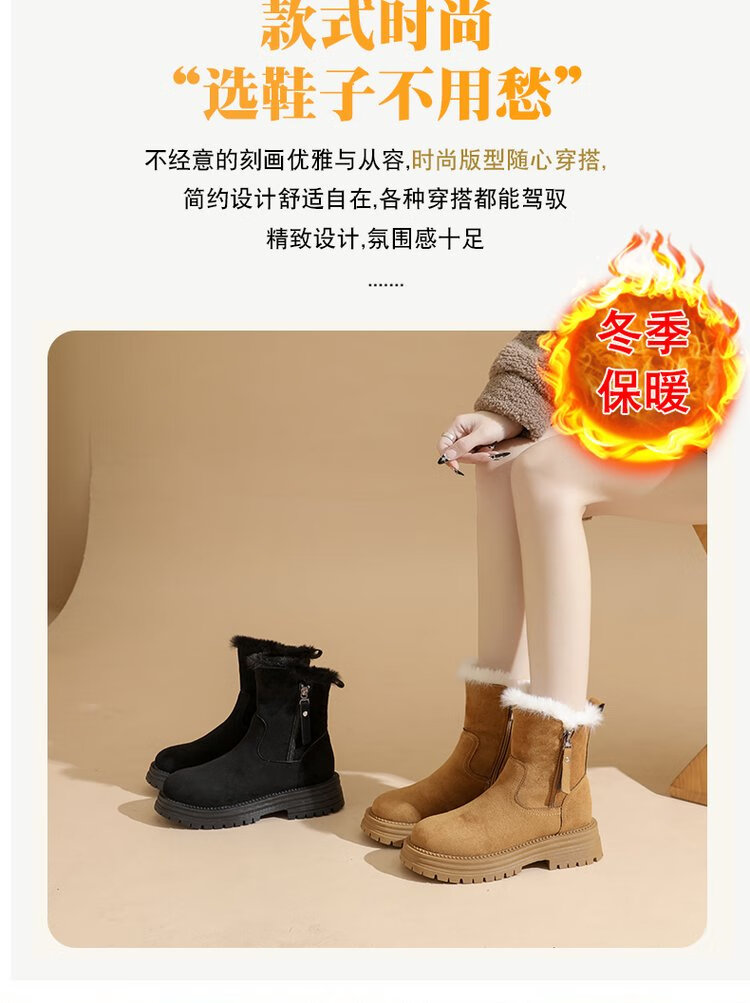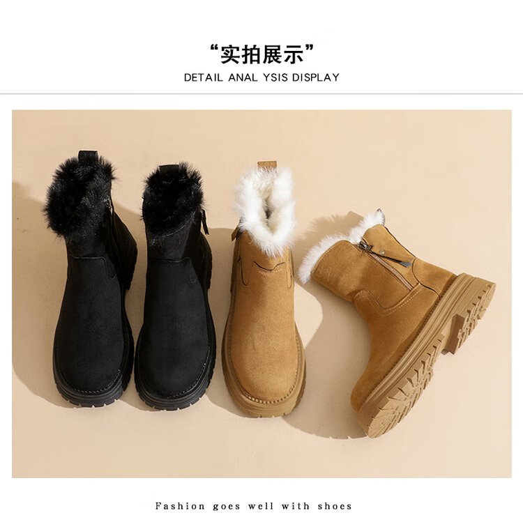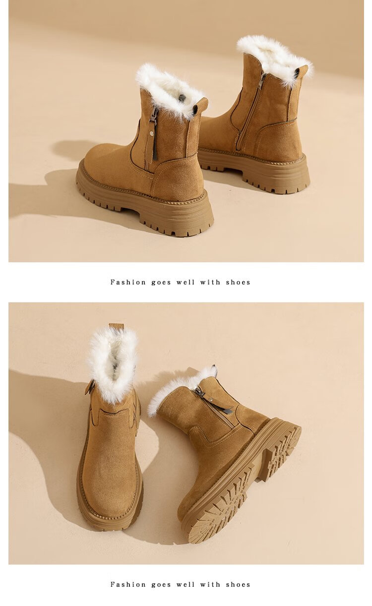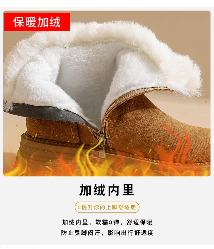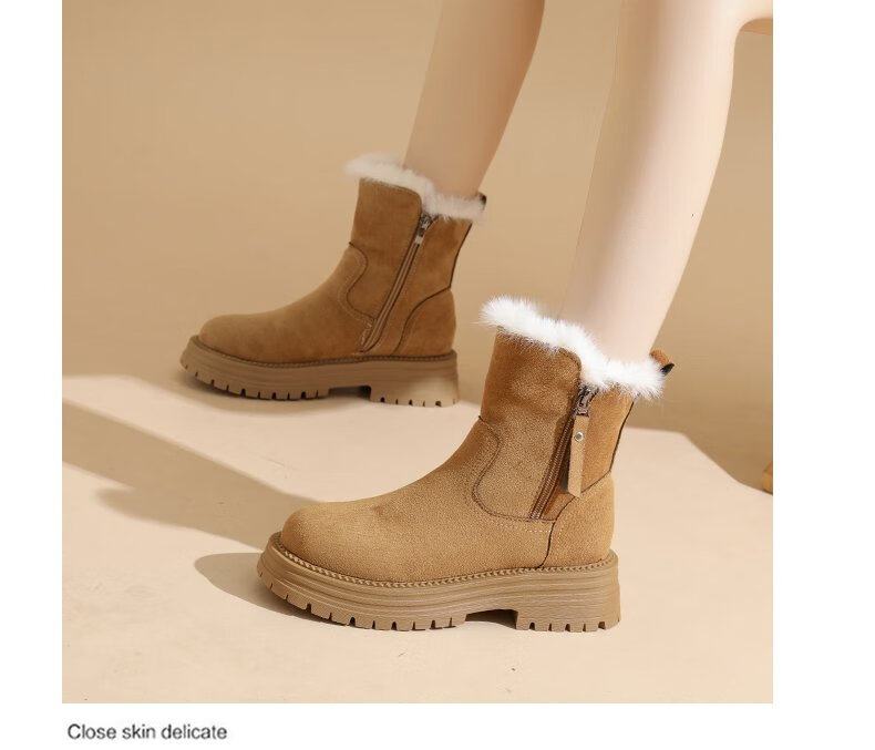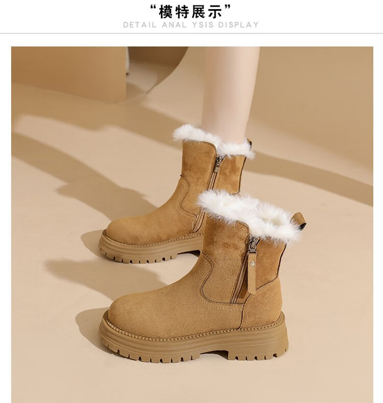 大东爆侧拉链橡胶中跟(3-5cm)人造短毛绒雪地靴冬季织物靴子粗跟 卡其色 40