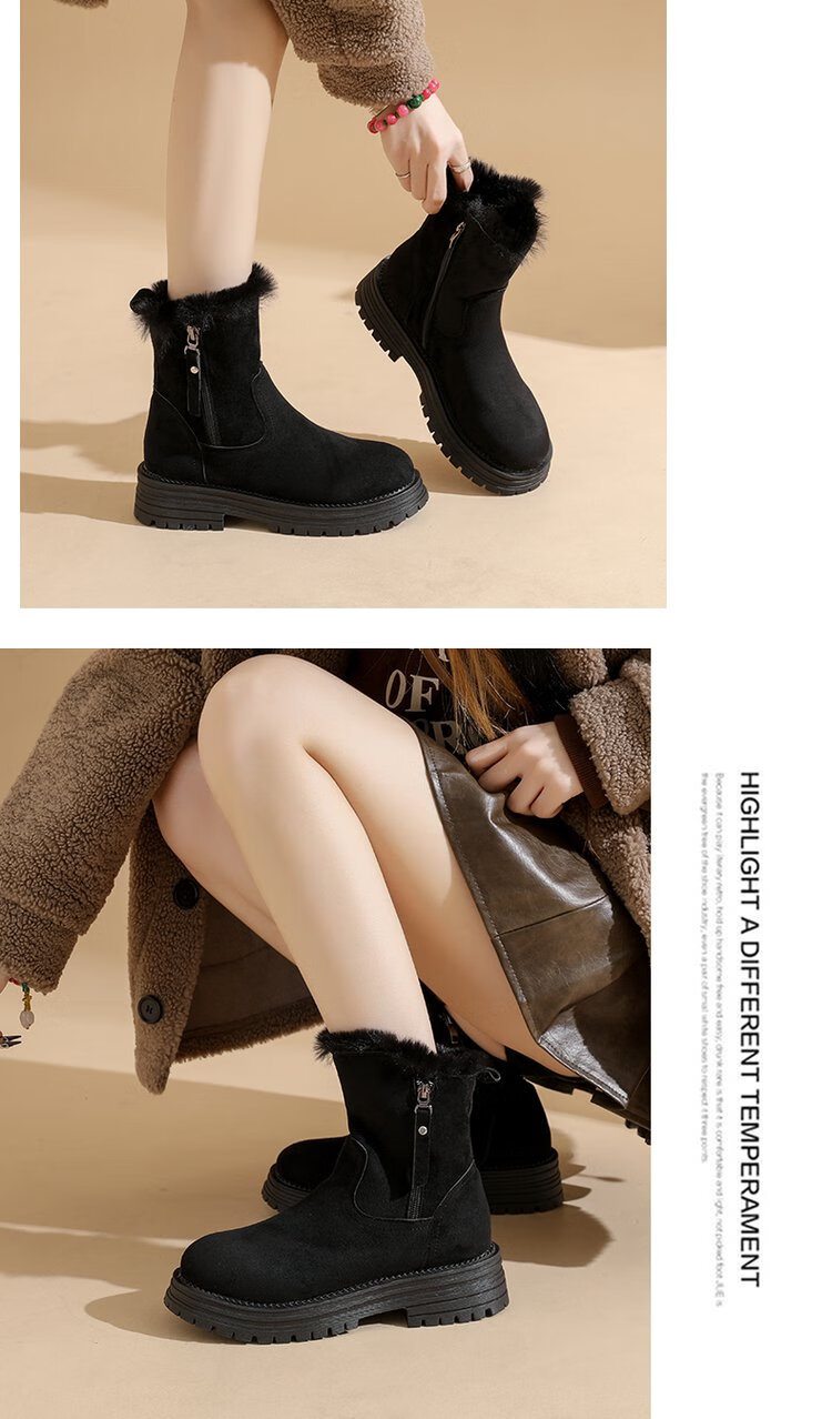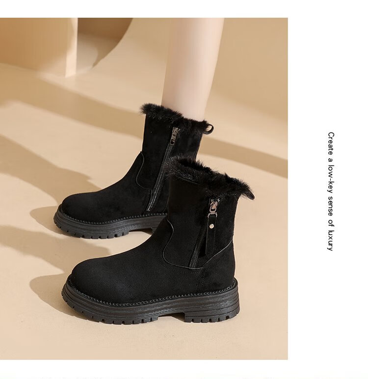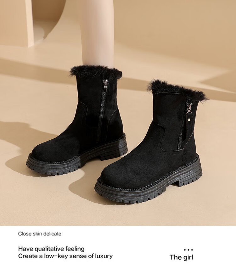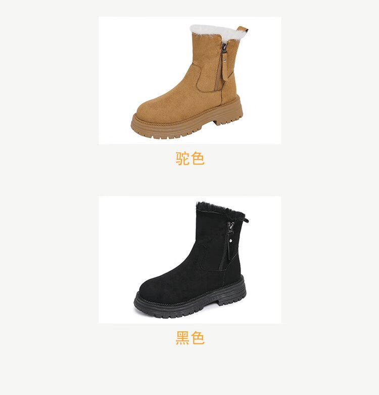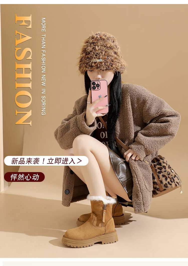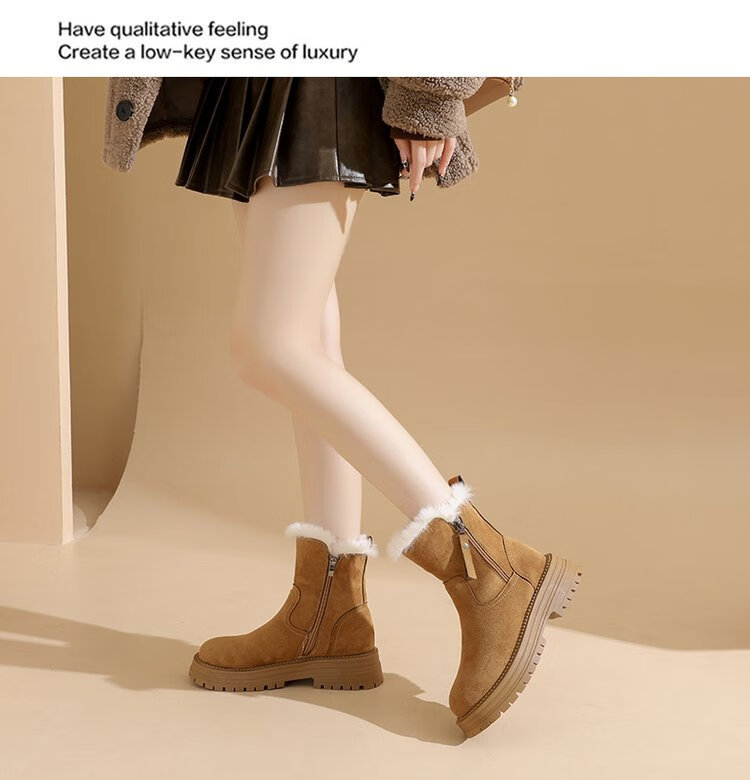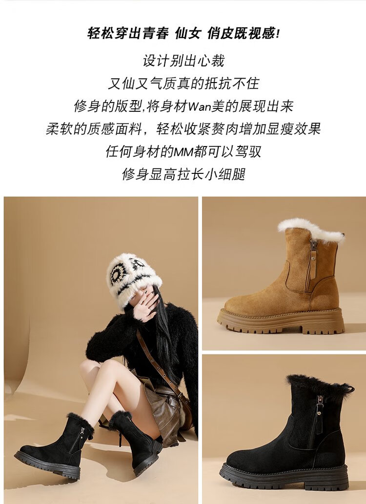 大东爆侧拉链橡胶中跟(3-5cm)人造短毛绒雪地靴冬季织物靴子粗跟 卡其色 40