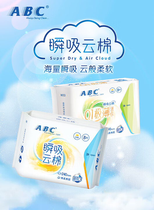 ABC瞬吸云棉卫生巾轻柔亲肤防漏不闷热透气姨妈巾日用组合装9包72片t 【云棉柔】日用组合72片(主推)