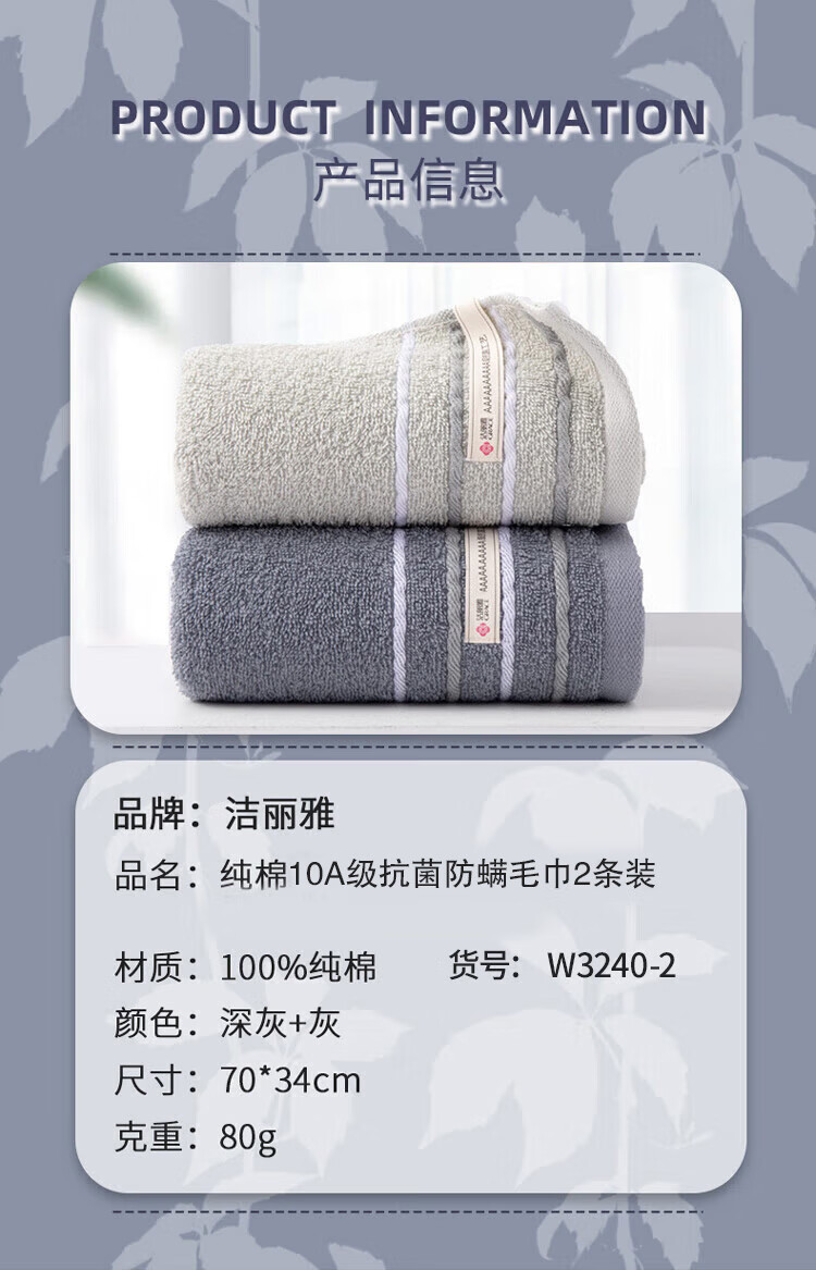 洁丽雅(Grace)纯棉10A级抗菌防螨全棉毛巾男士洗脸毛巾2条装柔软吸水洗澡擦脸巾