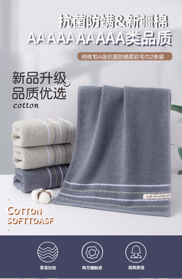 无印良品毛巾10A级抗菌新疆全棉男士100%纯棉毛巾2条装家用不易掉毛洗脸巾