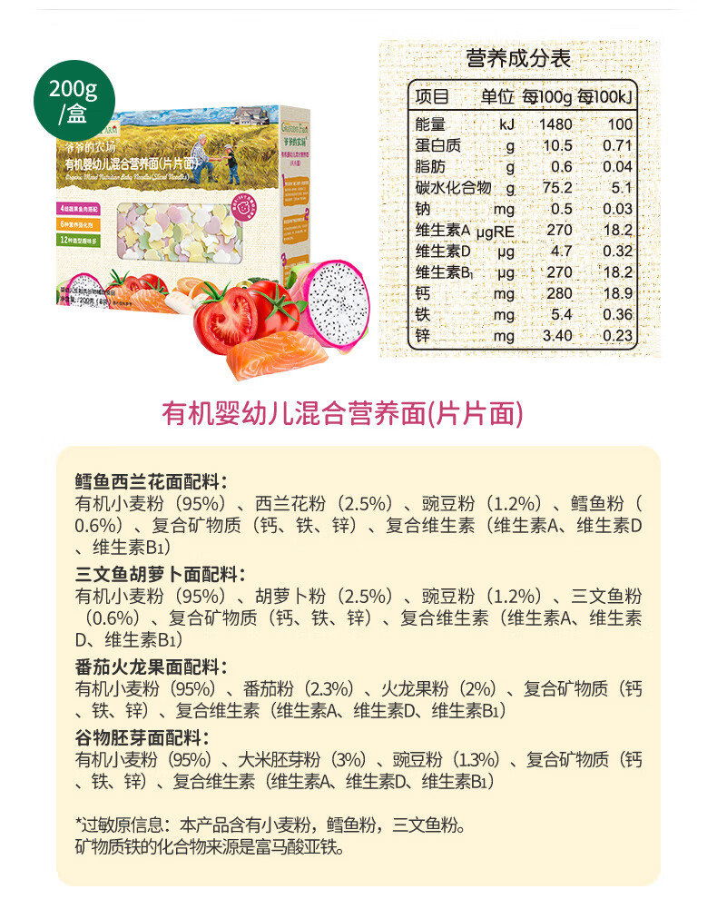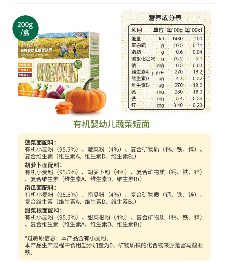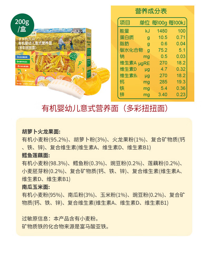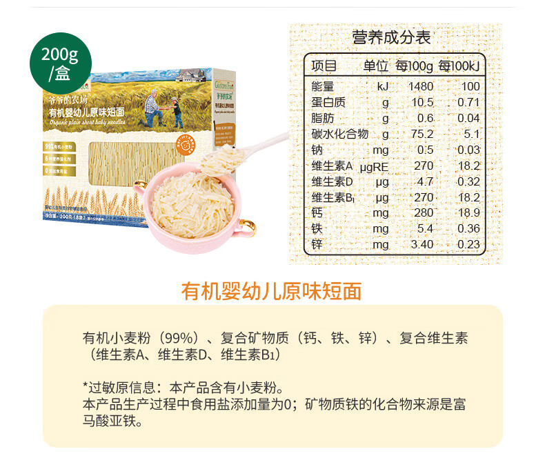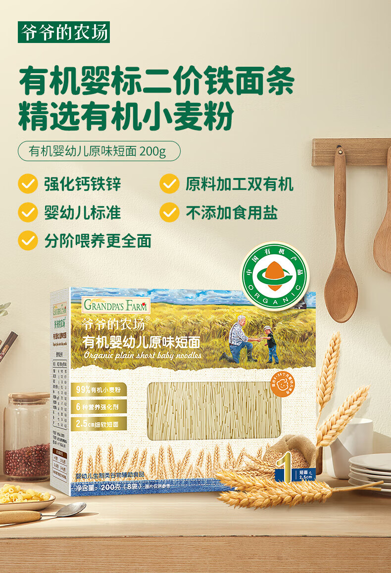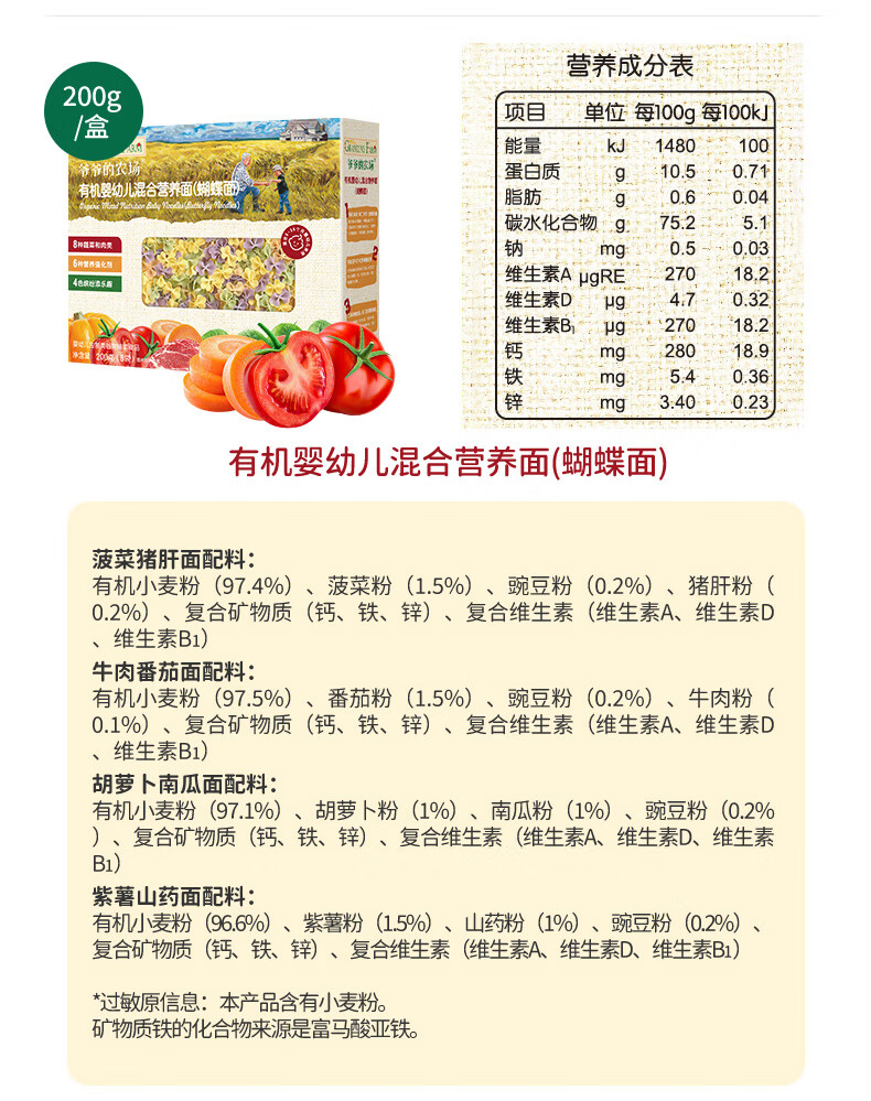 爷爷的农场宝宝主食有机面条 婴儿辅食 儿童婴幼儿无盐高铁面食婴儿面条 9月+混合营养蝴蝶面200g