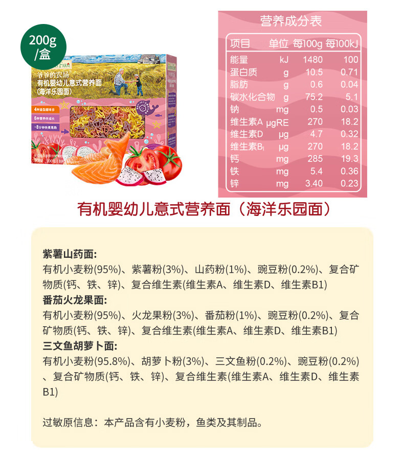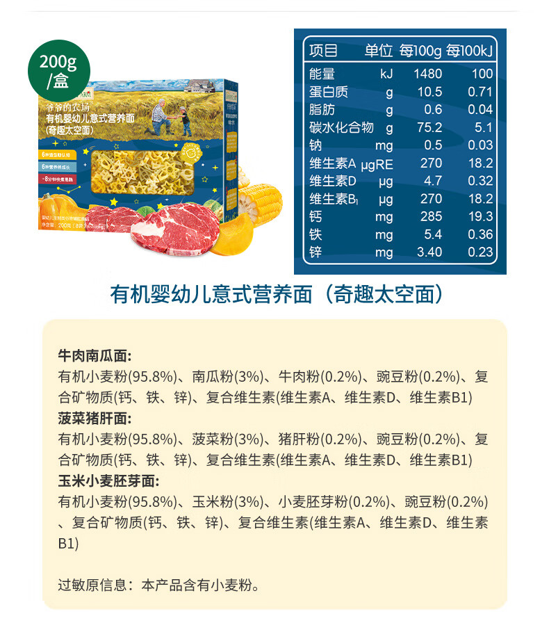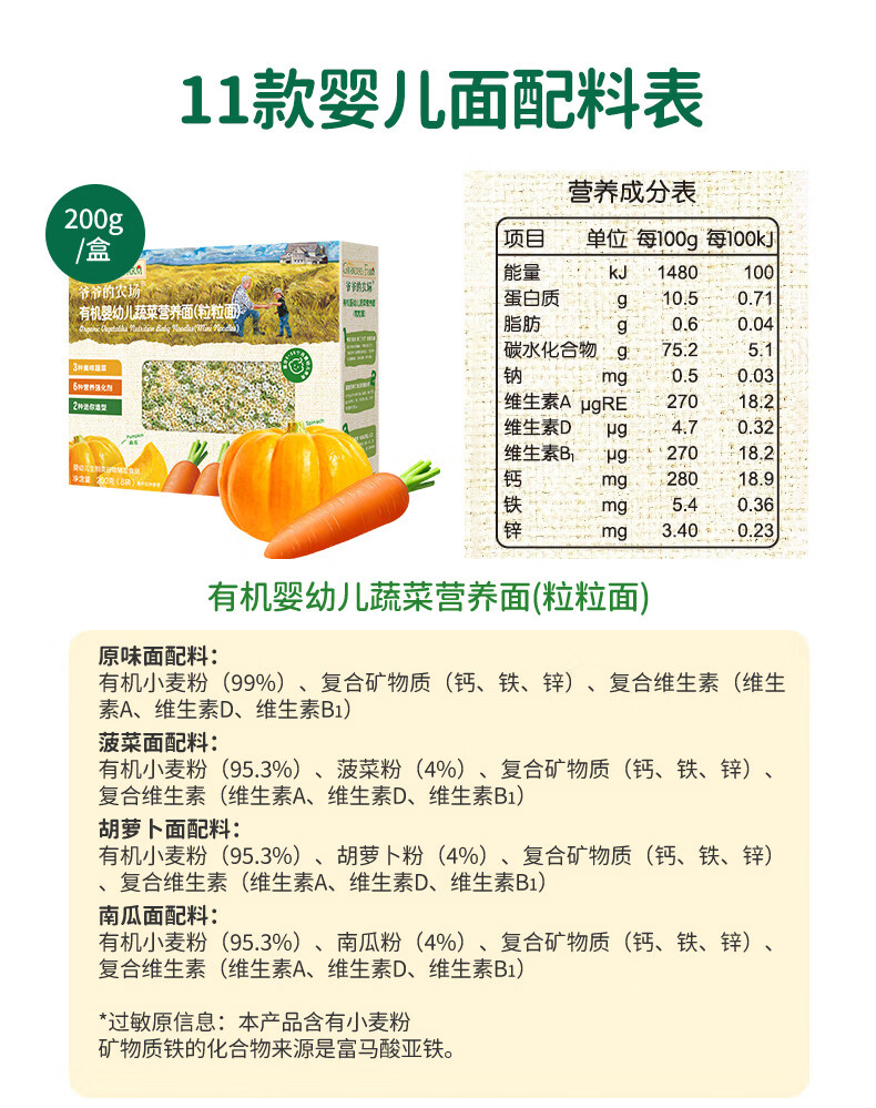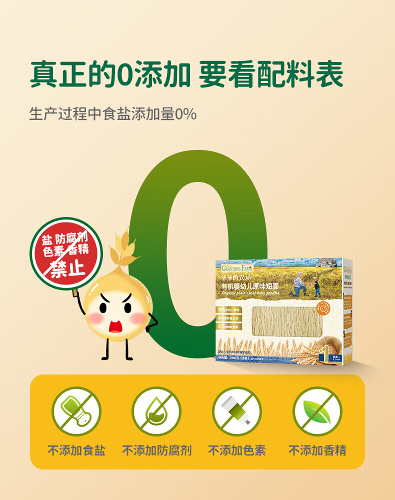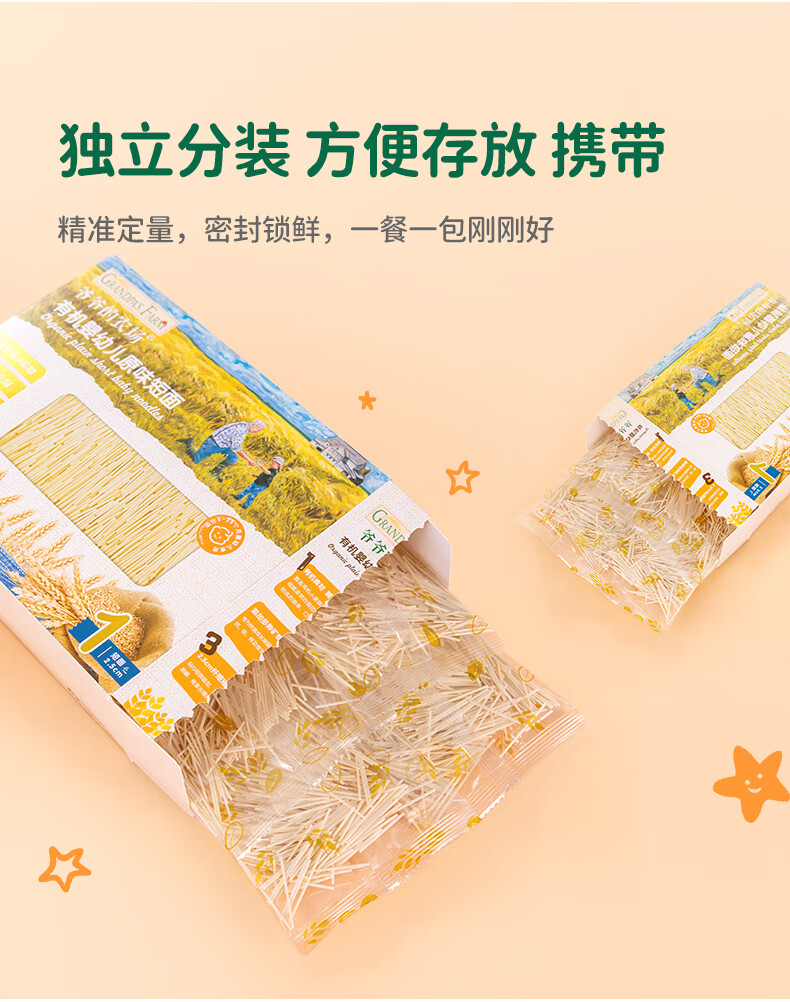 爷爷的农场宝宝主食有机面条 婴儿辅食 儿童婴幼儿无盐高铁面食婴儿面条 9月+混合营养蝴蝶面200g