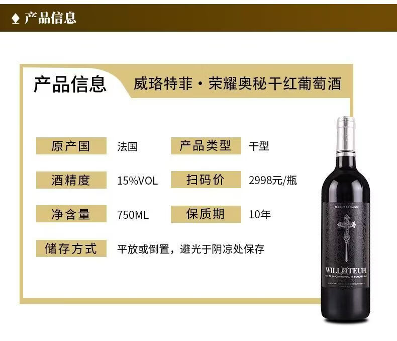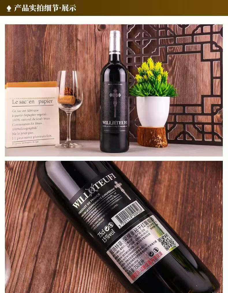 威珞特菲法国原瓶进口 荣耀奥秘干红葡萄酒高度红酒15度750ml 整箱6瓶